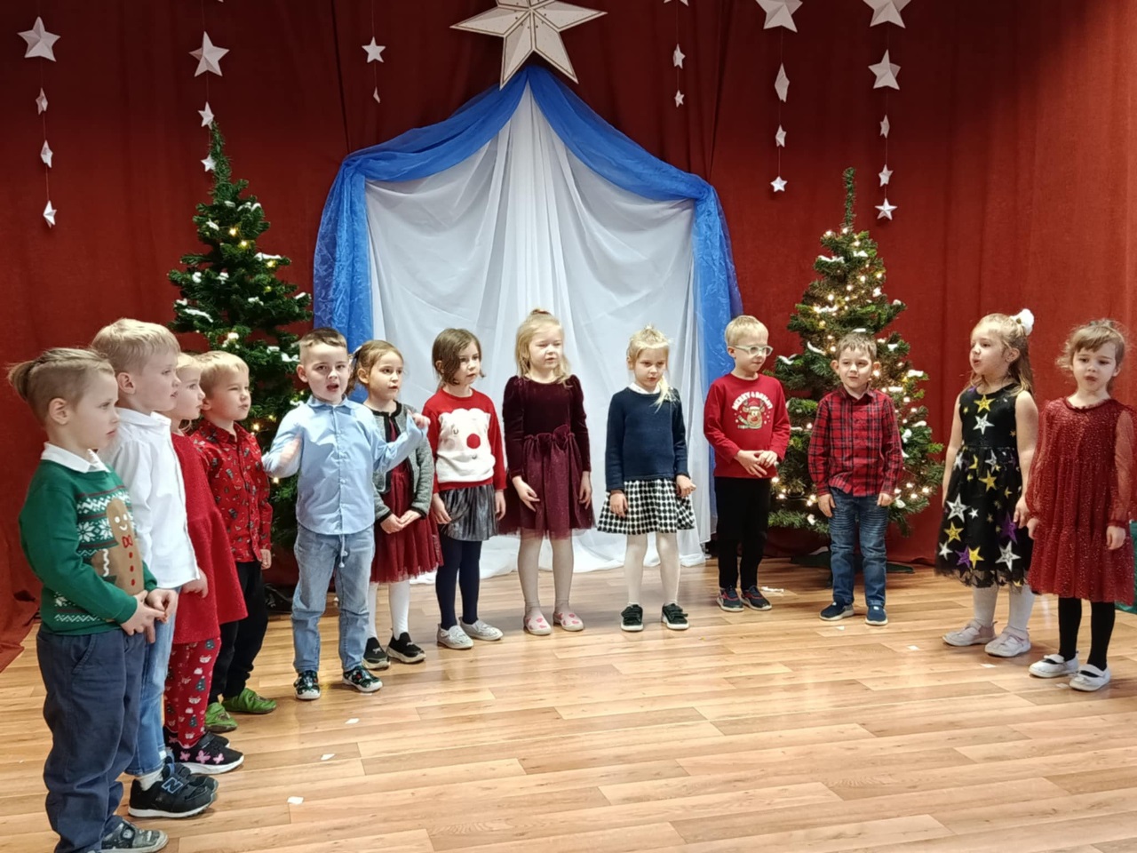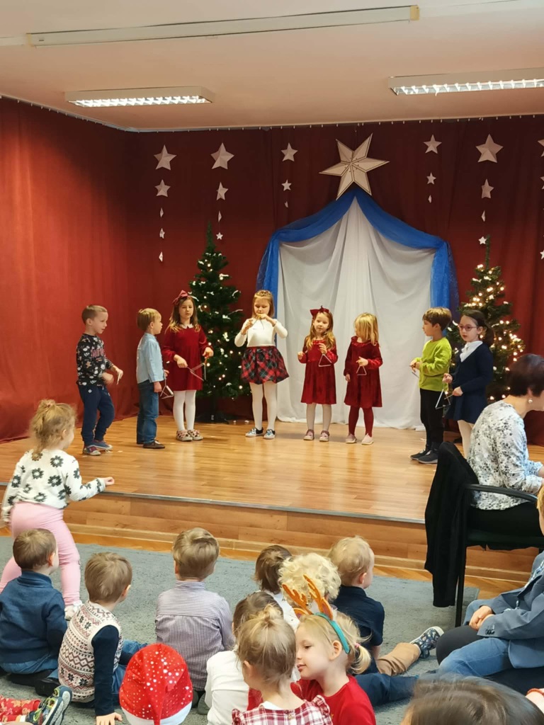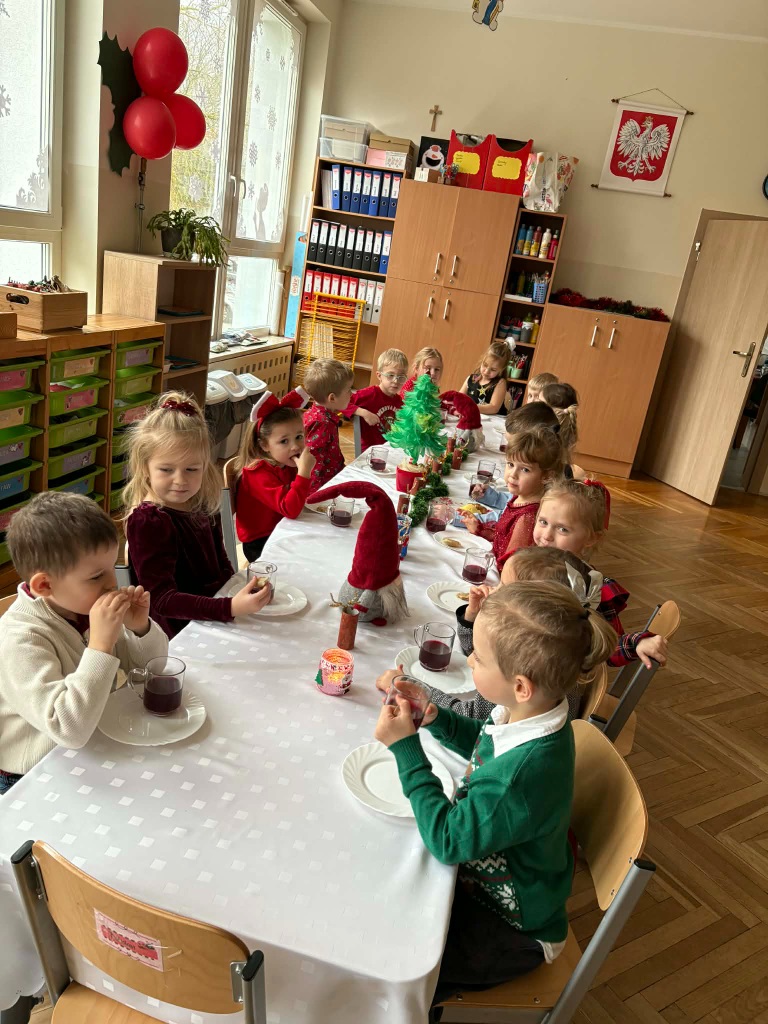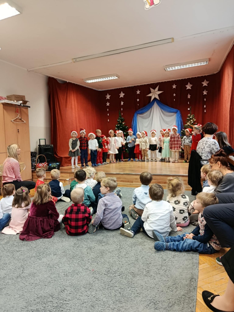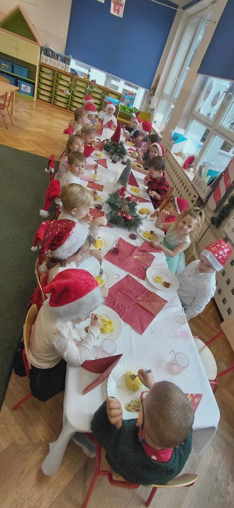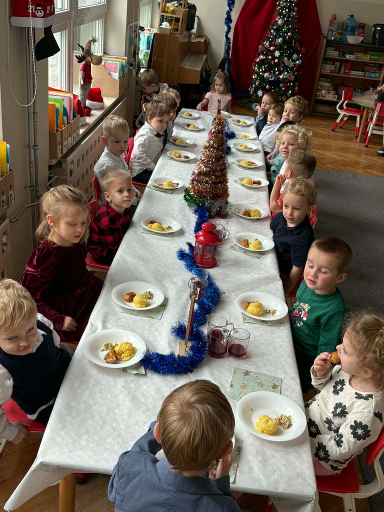 17 grudnia 2025 roku w naszym przedszkolu odbyło się wyjątkowe, świąteczne spotkanie z udziałem dzieci ze wszystkich grup. Każda z nich zaprezentowała się na scenie, śpiewając piękne świąteczne piosenki oraz kolędy, wprowadzając wszystkich w radosny, bożonarodzeniowy nastrój. Pani Dyrektor skierowała do całej społeczności przedszkolnej serdeczne życzenia z okazji nadchodzących Świąt Bożego Narodzenia. Następnie przedszkolaki z ogromnym zainteresowaniem obejrzały Jasełka przygotowane przez dzieci z grupy 0b. Zwieńczeniem tego wspaniałego dnia był uroczysty świąteczny obiad, podczas którego dzieci mogły skosztować tradycyjnych polskich potraw, takich jak barszczyk oraz pierogi. Był to dzień pełen radości, wzruszeń i świątecznej atmosfery. ![]()