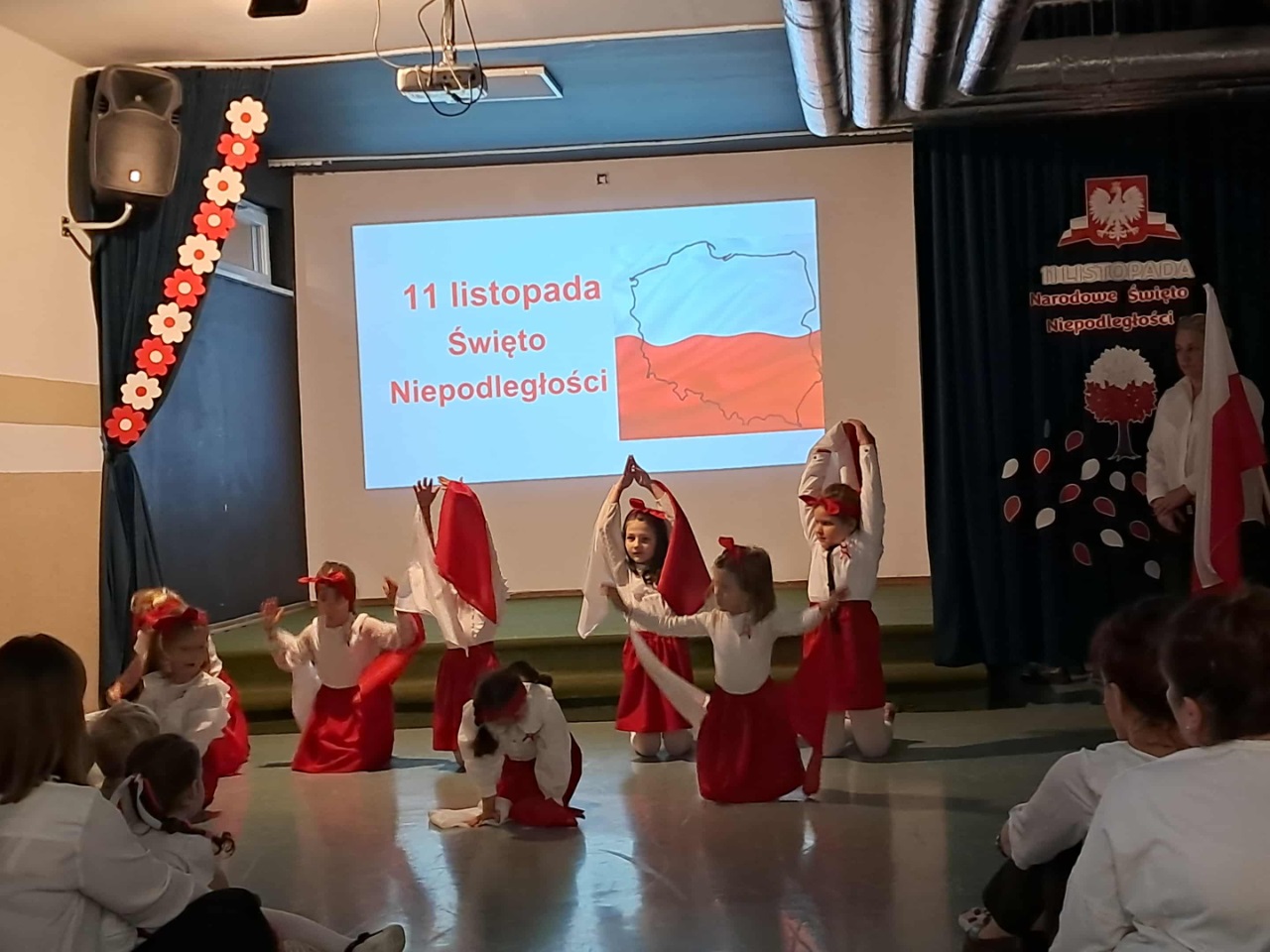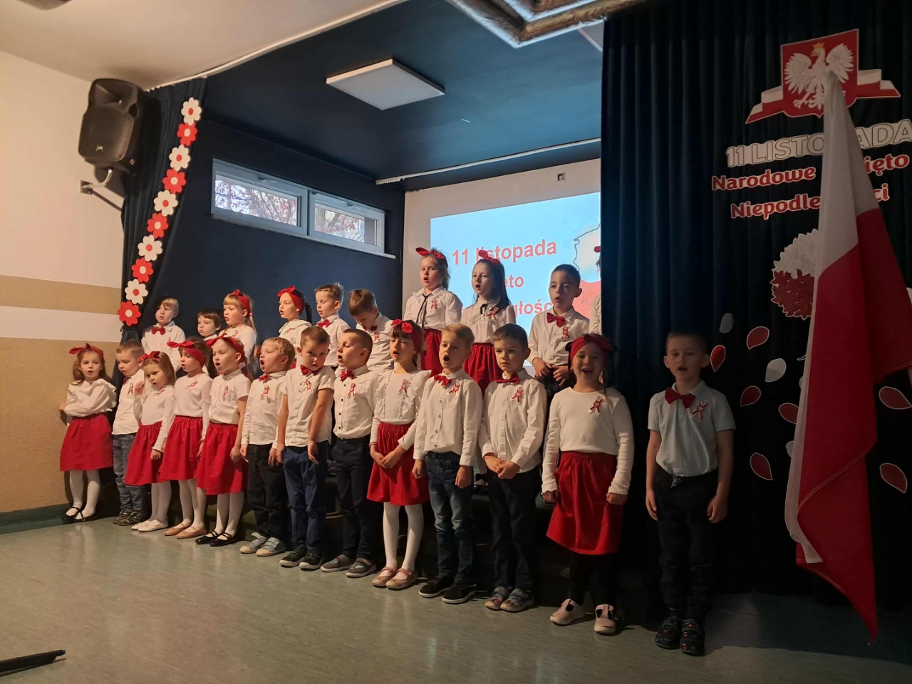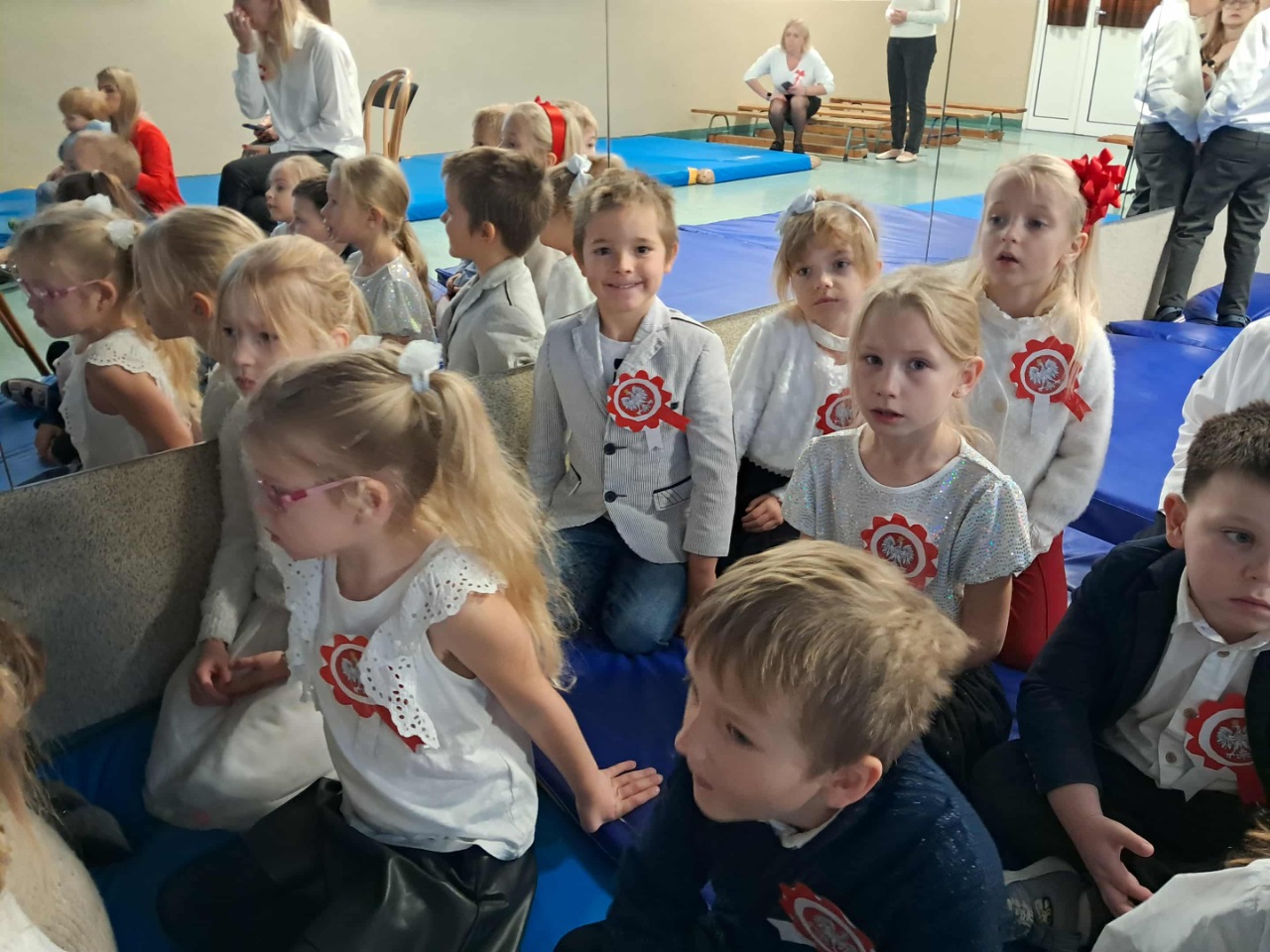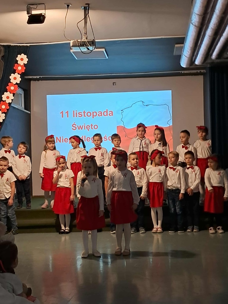 Podczas uroczystości mali artyści recytowali wiersze, śpiewali pieśni patriotyczne oraz zaprezentowali krótką inscenizację i taniec przypominającą o drodze Polski do wolności. Cała społeczność przedszkolna z dumą i wzruszeniem oglądała występ, a na zakończenie wszyscy wspólnie odśpiewali hymn narodowy.