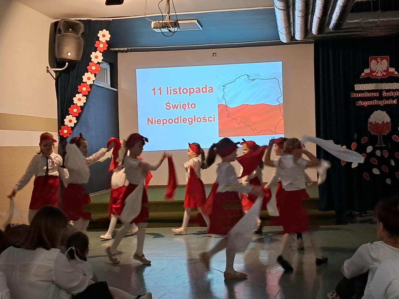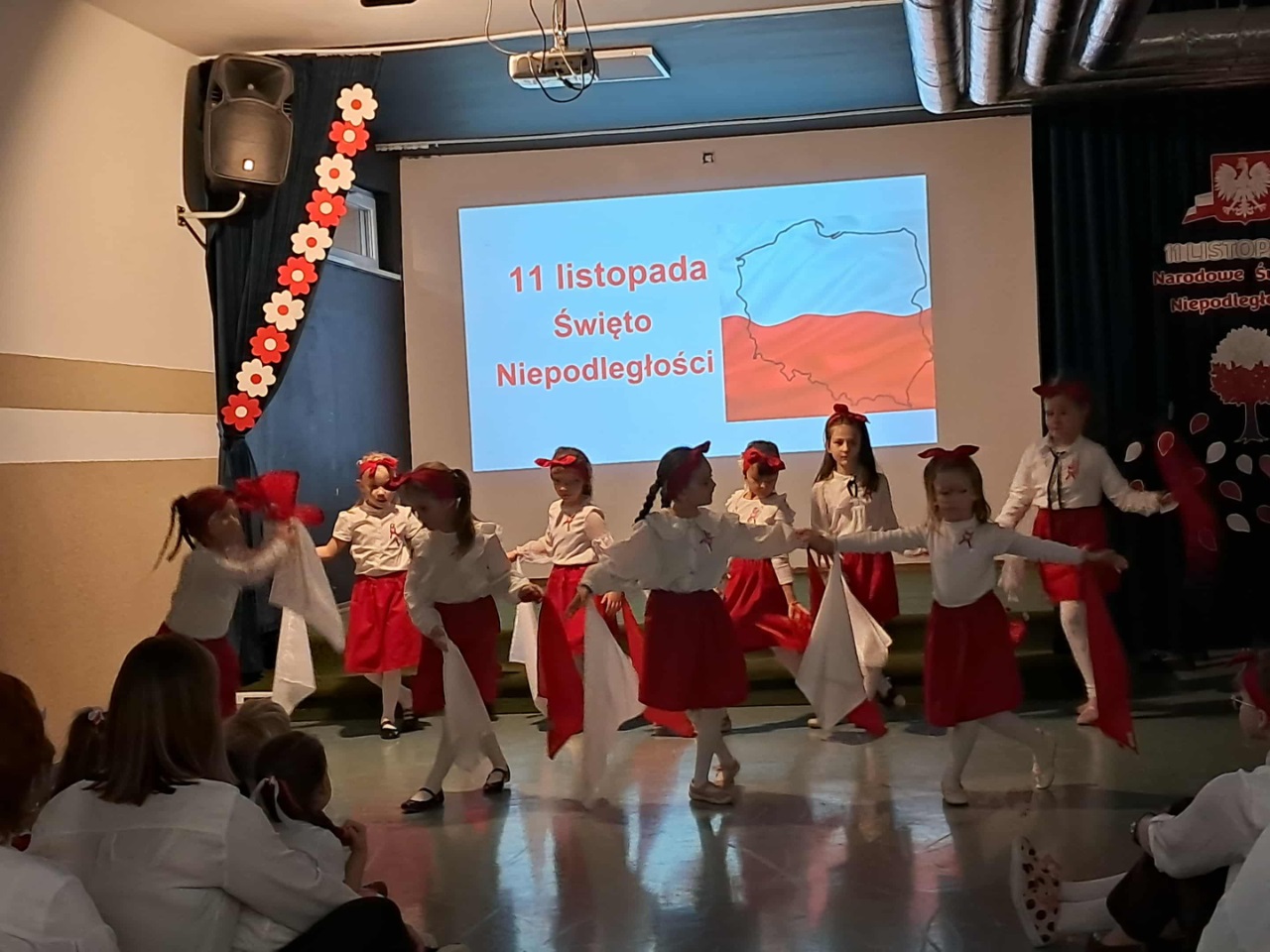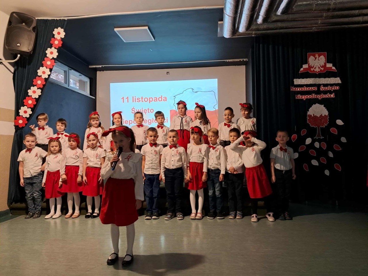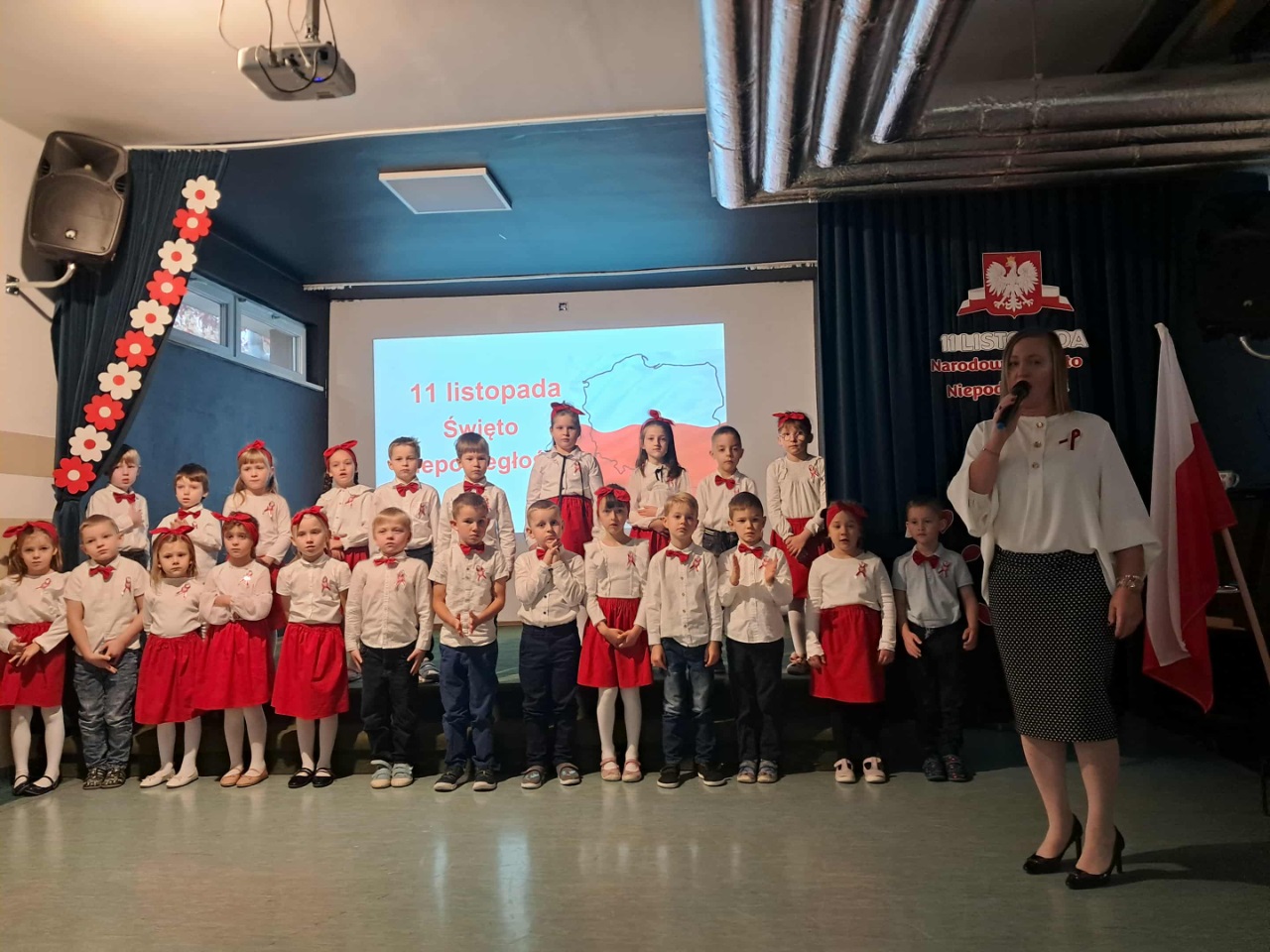 Podczas uroczystości mali artyści recytowali wiersze, śpiewali pieśni patriotyczne oraz zaprezentowali krótką inscenizację i taniec przypominającą o drodze Polski do wolności. Cała społeczność przedszkolna z dumą i wzruszeniem oglądała występ, a na zakończenie wszyscy wspólnie odśpiewali hymn narodowy.