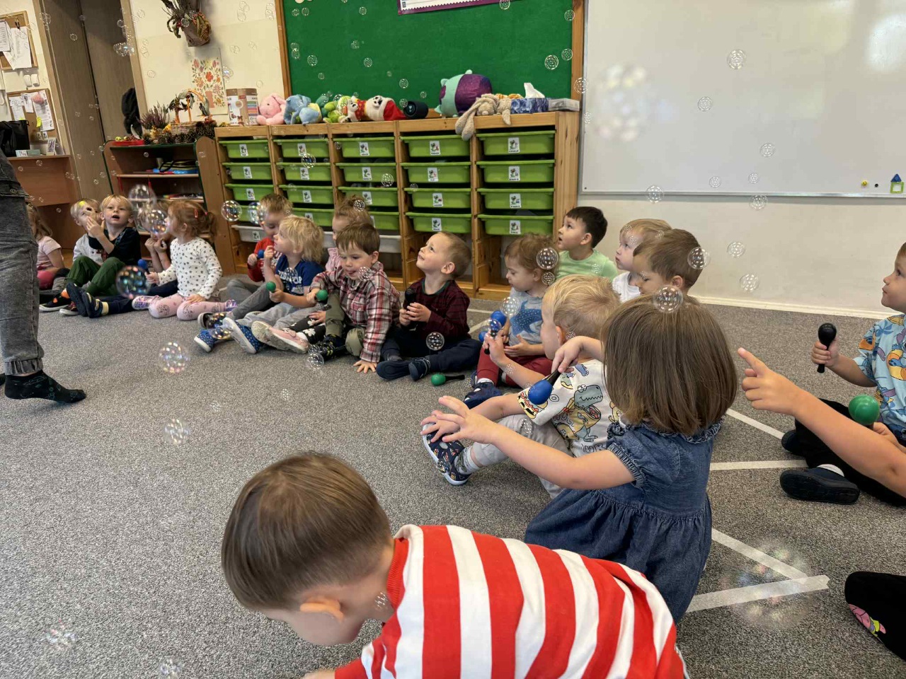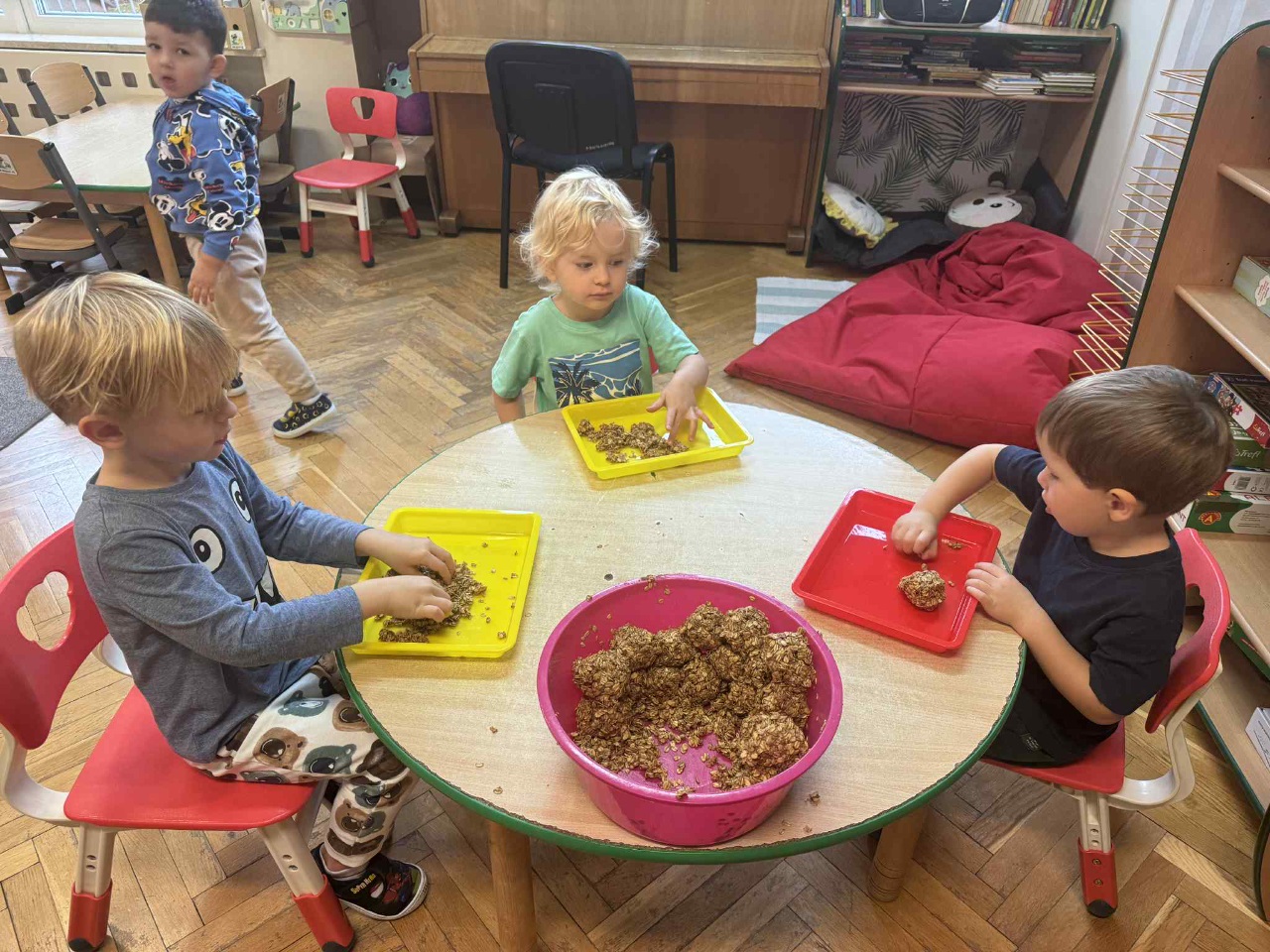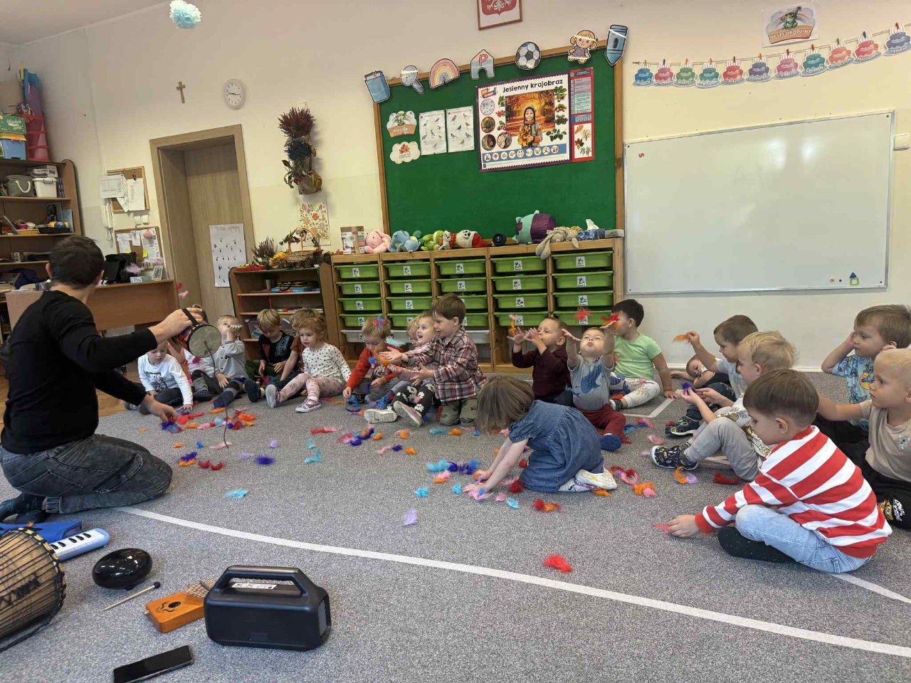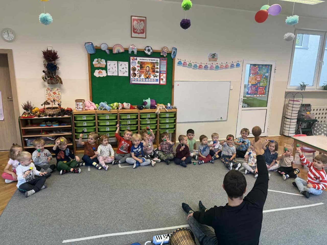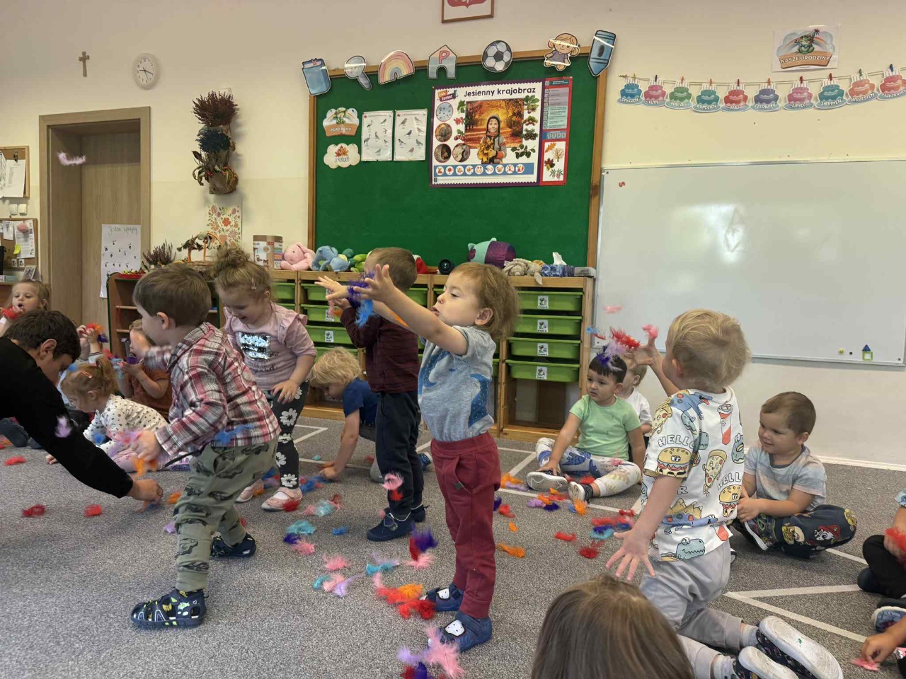Obchodziliśmy Dzień Kropki na których eksperymentowaliśmy, liczyliśmy, segregowaliśmy. Obchodziliśmy Dzień bezpieczeństwa na drodze, świętowaliśmy Dzień Przedszkolaka i Dzień Chłopca, na których tańczyliśmy, rozwiązywaliśmy zagadki i robiliśmy ciasteczka owsiane. W grupie w Dniu Muzyki odbyły się warsztaty muzyczne z Panem Kamilem, które zahipnotyzowaly dzieci. Tworzyliśmy zabawki kreatywne, które wspomagają naszą motorykę małą i wspierają w rozwoju. Uczestniczyliśmy w przedstawieniu, dwójka dzieci z naszej grupy wystąpiła na scenie w roli aktora.